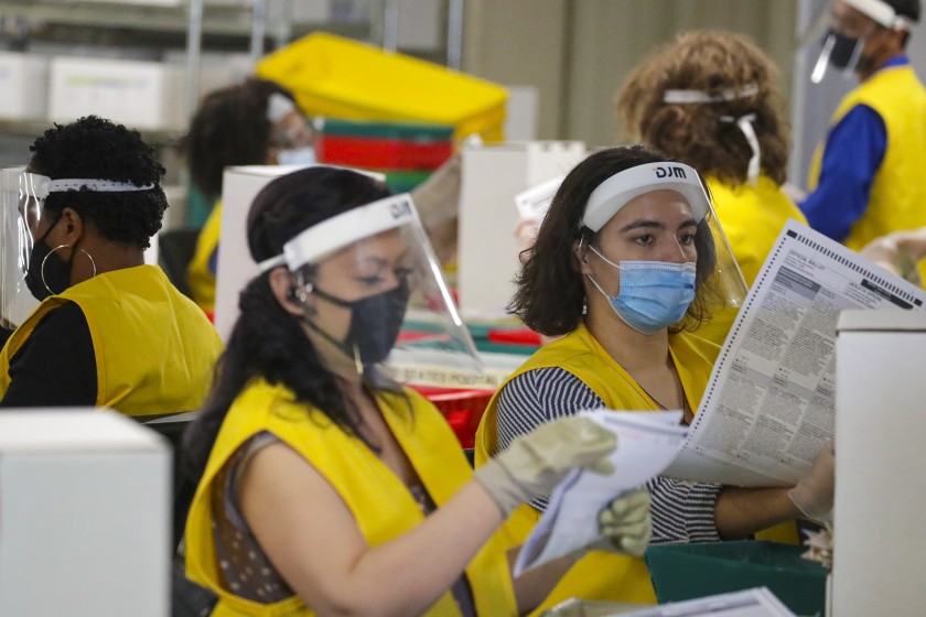 Nerissa Buelna, izquierda, y Vivian Morales revisan las boletas antes de enviarlas para su conteo a la oficina del Registro de Votantes del Condado de San Bernardino el jueves 5 de noviembre de 2020 en San Bernardino, CA.(Irfan Khan/Los Angeles Times)
