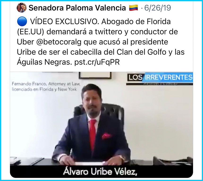La demanda de Uribe contra Beto Coral comenzó a ser promovida, a modo de acoso judicial, por la senadora Paloma Valencia.