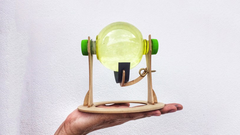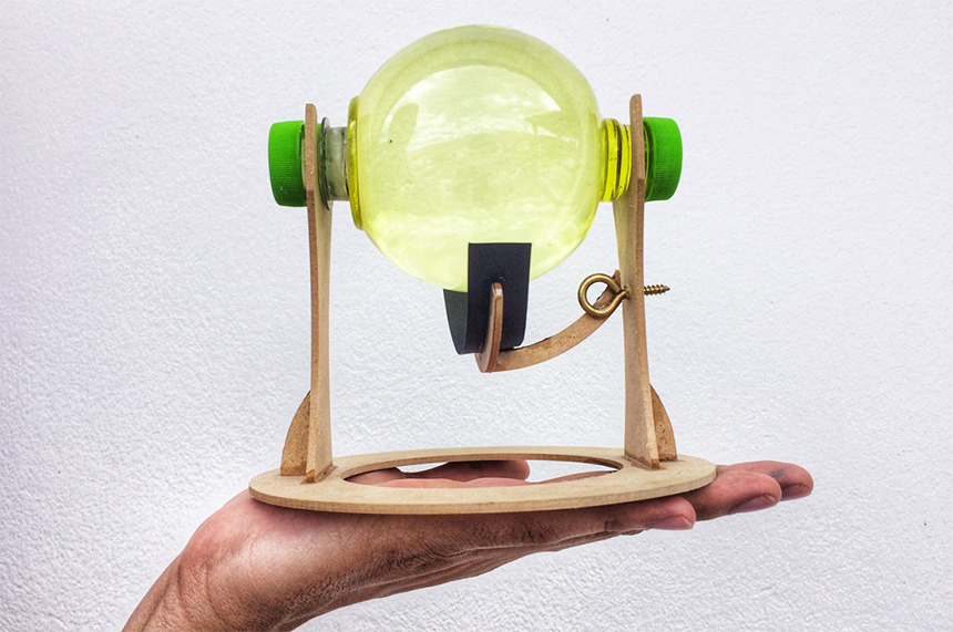 En el prototipo, la base es de madera, mientras que la esfera es de plástico. Usaron una botella que tomaron en la basura, de las que se emplean en las peluquerías para echar gel u otras sustancias.