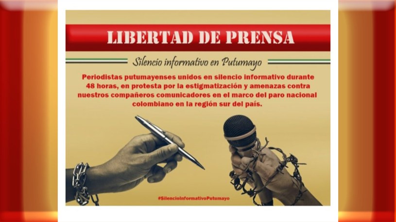 Los Periodistas del departamento del Putumayo y ante los últimos acontecimientos que han tenido lugar en nuestra región después de analizar las situaciones presentadas con colegas de distintos medios de comunicación, a quienes se les ha señalado, amenazado, intimidado y estigmatizado por los distintos sectores de la sociedad putumayense tanto del orden estatal como no estatal en medio de la protesta social hemos decidido lo siguiente: