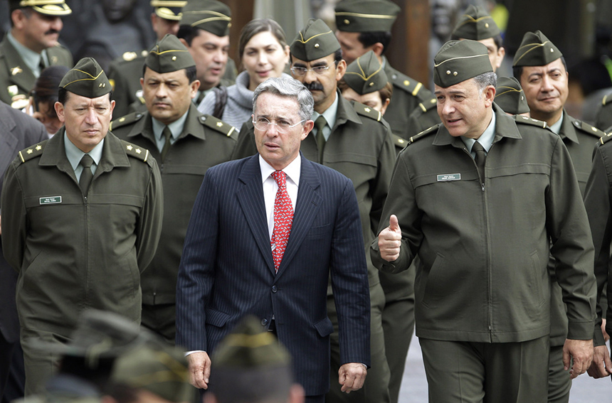 El expresidente de Colombia, Álvaro Uribe, en el centro, y el exjefe de policía de Colombia, general Oscar Naranjo, el 2 de agosto de 2010Fernando Vergara / AP