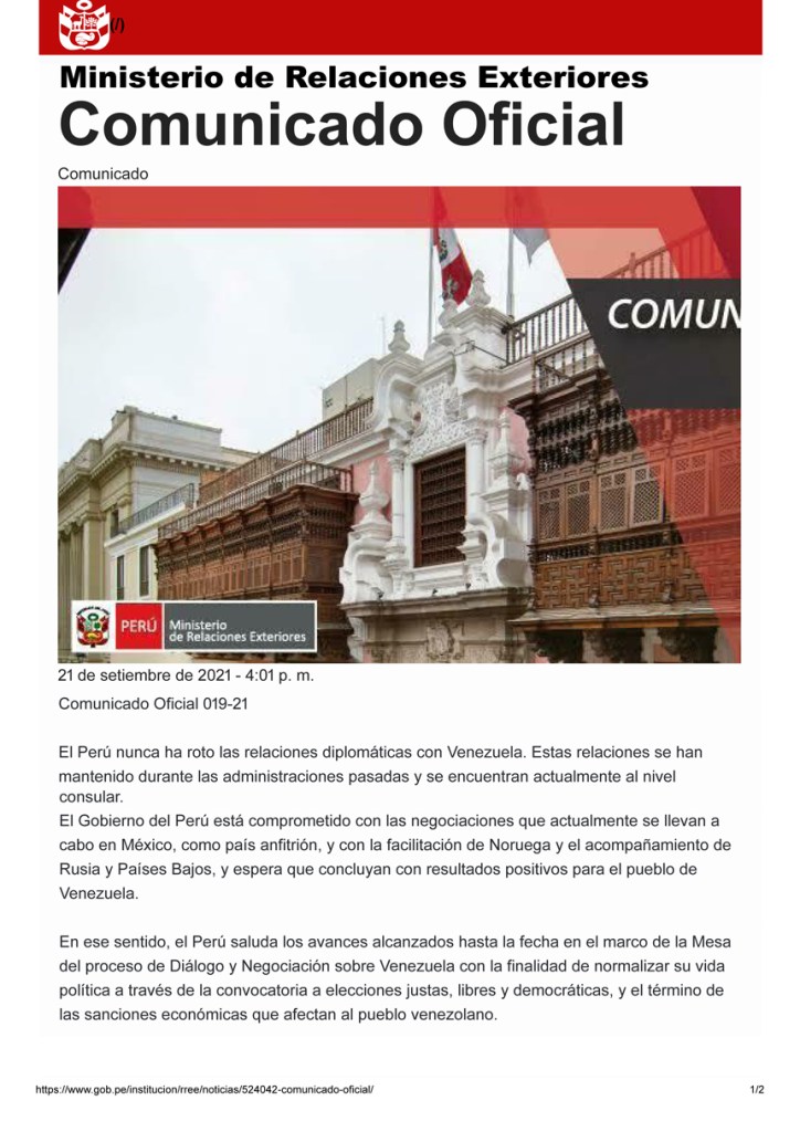 «El Perú nunca ha roto las relaciones diplomáticas con Venezuela. Estas relaciones se han mantenido durante las administraciones pasadas y se encuentran actualmente a nivel consular», reza el comunicado del ministerio, emitido tras la reciente polémica abierta por su vicecanciller Luis Enrique Chávez.