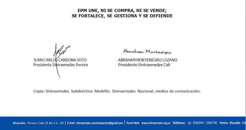 - JUAN CARLOS CARDONA SOTO Presidente Sintraemsdes Pereira
