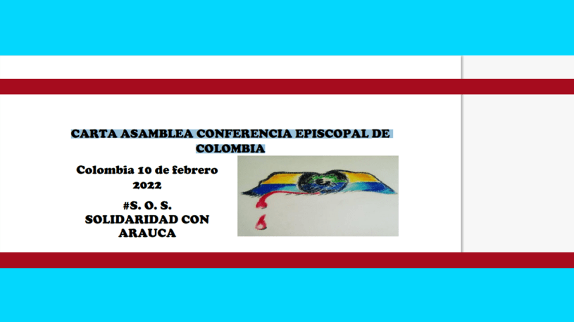 Mediante la presente, las personas y organizaciones abajo firmantes, muy respetuosamente nos dirigimos ante esta importante Asamblea de Obispos, en especial a los representantes de la Orinoquia, con el fin de invitarles para prestar sus buenos oficios a través de pronunciamientos públicos y acciones pastorales puedan ayudar a superar la grave crisis humanitaria que desde el pasado 2 de enero de 2022, se viene presentando en el departamento de Arauca, en hechos que han costado la vida de más de 70 personas, masacres, desplazamientos forzados y atentados contra edificios públicos de organizaciones sociales de defensores y defensoras de derechos humanos, entre otros hechos que tienen sumida a la población civil en el miedo y la zozobra y es preocupante el silencio institucional y de la sociedad en general por los que es necesario consolidar acciones en pro de detener estos lamentable sucesos que se vienen presentando en la región.