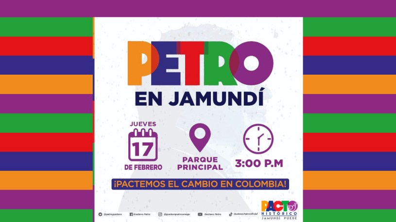 La dirección del Pacto Histórico en el departamento de Valle del Cauca invita a los habitantes de Jamundí y municipios vecinos para que participen el Jueves 17 de febrero de 2022 a partir de las 3.00 de la tarde en el parque principal de la ciudad, en el evento se contará con presencia como invitado especial del aspirante presidencial Gustavo Petro Urrego, quien cuenta con la mayor favorabilidad según las encuestas para ganar la contienda en Mayo próximo. A su lado participarán los integrantes de la lista por el Pacto Historico a la Cámara de Representantes por este departamento.