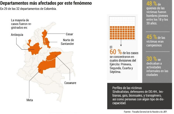 La Jurisdicción Especial para la Paz (JEP) -sistema de justicia transicional creado en los Acuerdos de Paz de 2016 entre el Gobierno y las FARC-EP- informó en febrero de 2021 de que al menos 6.402 personas “fueron víctimas de muertes ilegítimamente presentadas como bajas en combate”, durante el periodo 2002-2008.