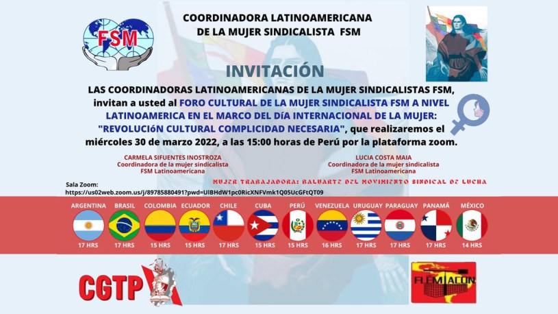 Omar Romero, ejecutivo nacional de la Central Unitaria de Trabajadores CUT y Coordinador de la Federación Sindical Mundial FSM en la región latinoaméricana invita a participar del Foro Cultural de la Mujer Sindicalista FSM en el marco del Día Internacional de la Mujer: «Revolución cultural, complicidad necesaria».