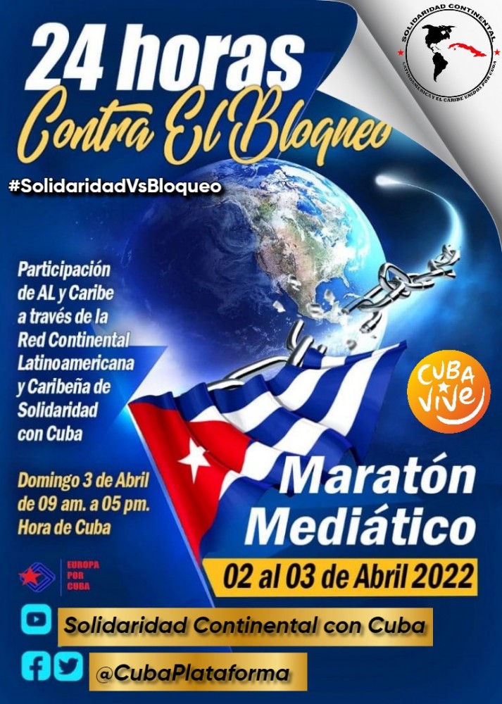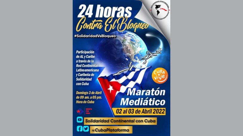 Desde las redes sociales como YouTube y Telegram, la radio, la televisión y los medios alternativos se realizará el 2 y el 3 de abril un maratón mediático mundial para rechazar el bloqueo estadounidense contra la Isla. Ha sido convocado por el canal Europa por Cuba y apoyado por colectivos de solidaridad de varios países, entre ellos el MESC (Movimiento Estatal de Solidaridad con Cuba), que agrupa a 58 organizaciones del Estado español. Europa por Cuba realizará un programa especial durante el domingo, de 9 de la mañana a 5 de la tarde, hora española.