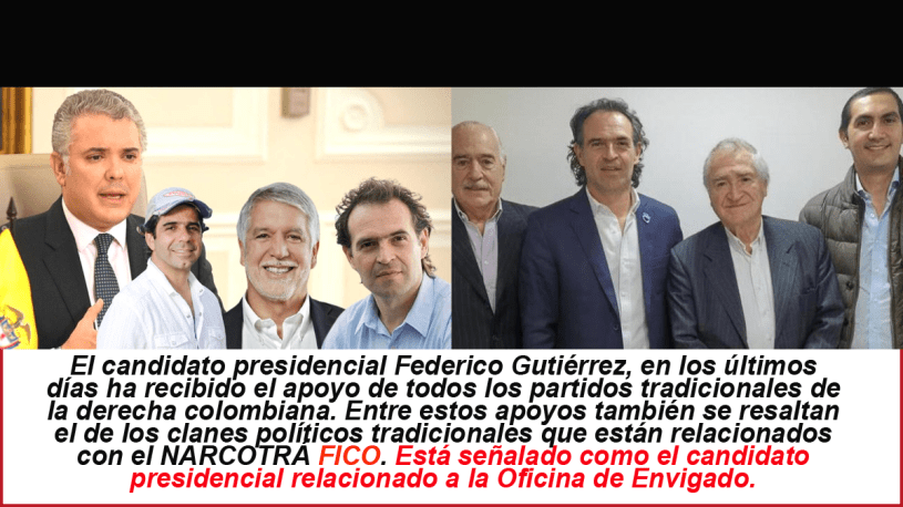 El candidato presidencial Federico Gutiérrez, en los últimos días ha recibido el apoyo de todos los partidos tradicionales de la derecha colombiana. Entre estos apoyos también se resaltan el de los clanes políticos tradicionales que están relacionados con el NARCOTRÁ FICO. Está señalado como el candidato presidencial relacionado a la Oficina de Envigado.
