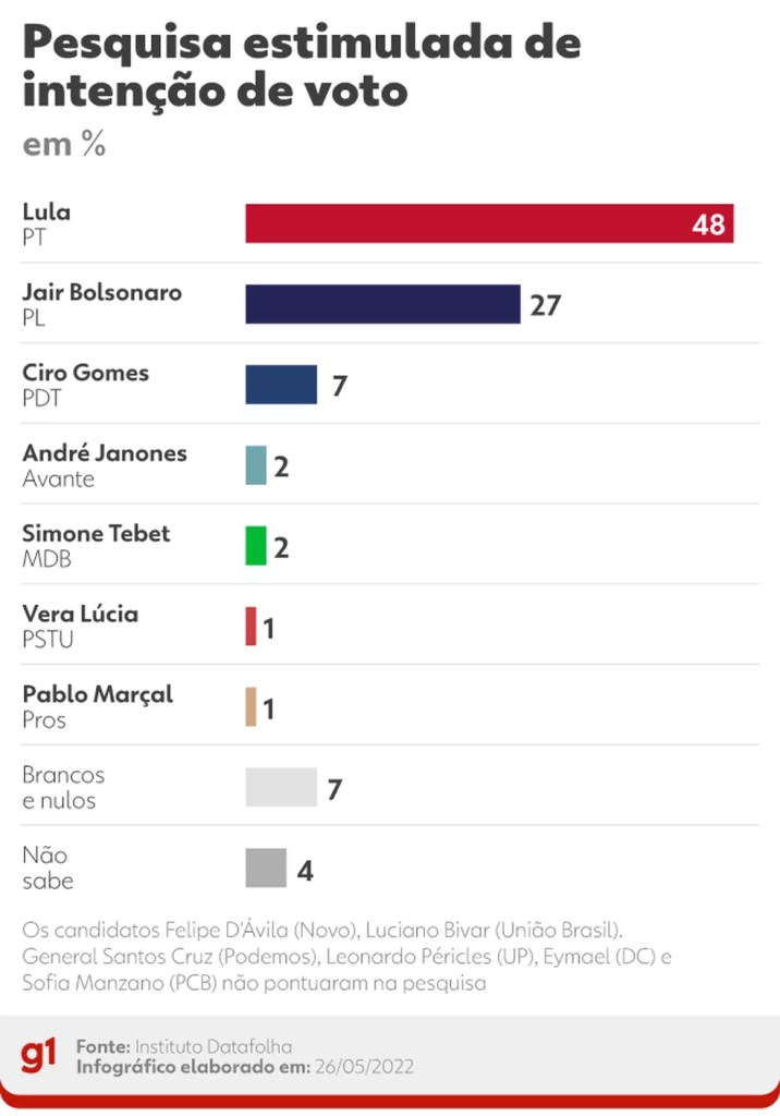 La encuesta presencial arrojó que Lula vencería en la primera vuelta teniendo en cuenta los sufragios válidos, es decir, descartando los votos en blanco y anulados, con 21 puntos de diferencia sobre el jefe del Estado. Según Datafolha, Lula vence con 48% de los votos contra 27% de Bolsonaro, del Partido Liberal, y el 7% de Ciro Gomes, del Partido Democrático Laborista (PDT).