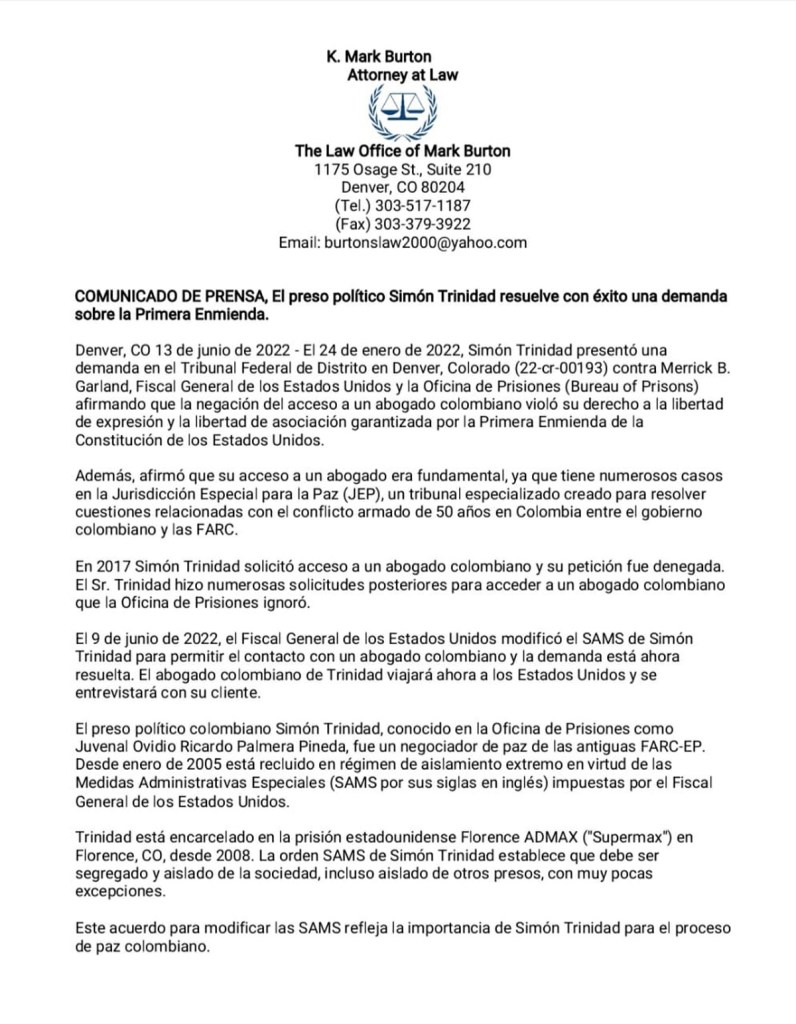 Liliany Obando dijo que valora positivamente que por fin, después de 16 años de injusta prisión en una cárcel de máxima seguridad estadounidense se le garantice a Simón como prisionero político su derecho a tener un abogado de confianza en Colombia y por esa vía se posibilite que Simón, como firmante del Acuerdo de Paz de La Habana, pueda atender los llamados ante la JEP y la Comisión de la Verdad.