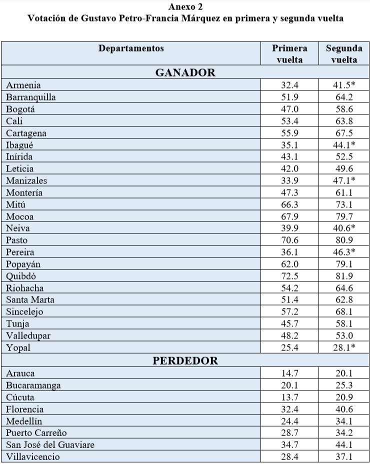 Las ciudades capitales más pobladas del país, incluidas Bucaramanga, bastión de Rodolfo Hernández, hicieron la diferencia. En la primera vuelta seis capitales le aportaron casi el 40.0% de sus votos y en la segunda vuelta fueron 3.729.304 votos, el 33.05%. Además, ganó en primera vuelta en 23 de las 32 capitales en primera vuelta y 16 en la segunda, con resultados muy parejos en las otras 7 (ver anexo 1). En la segunda vuelta hubo una masiva movilización más favorable a Petro en Cali, Bogotá, Barranquilla, Bucaramanga y Medellín. Esto último sorprende por ser una fortaleza del excandidato Gutiérrez y del propio Álvaro Uribe. Lo respaldó el votante urbano, que se supone es más informado, más autónomo, sin ligaduras partidistas y sin lealtades a patronos políticos.