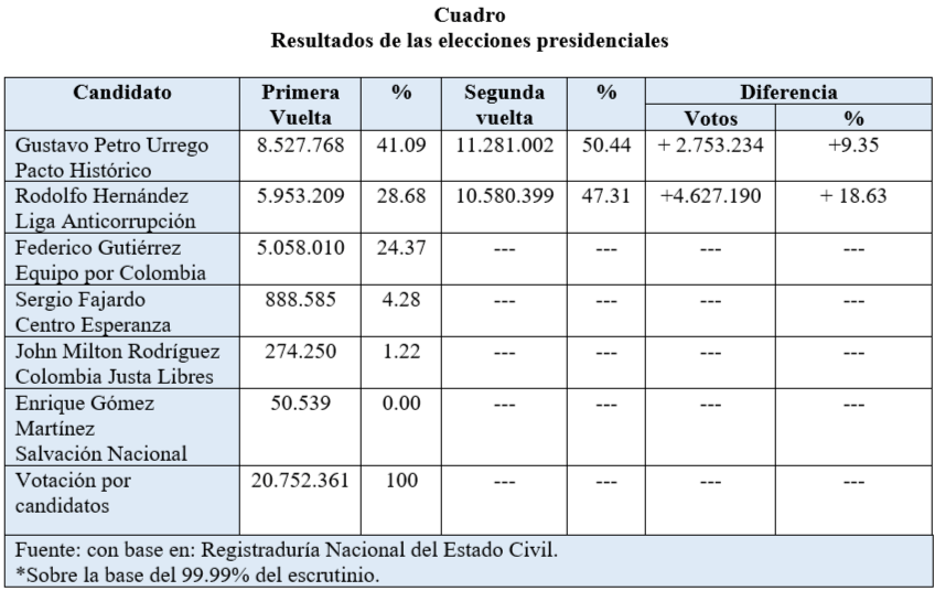 Fue una elección muy competida. Petro ganó por una diferencia de 3,2% y las mayorías territoriales estuvieron divididas, con ventaja en ambas vueltas en 17 departamentos y minorías en 16 (incluida Bogotá). Ganó en toda la región Caribe y en el sur occidente, y perdió en la región cafetera, en el centro del país (excepto Bogotá), en el nororiente y en algunos departamentos de la Orinoquia (ver anexo 1).