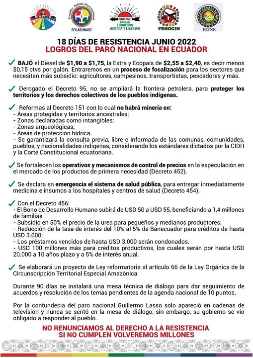 La CONAIE y las demás organizaciones del campo popular ecuatoriano han demostrado al país y al mundo que la movilización y la lucha sirven siempre para lograr avances, que a veces pueden ser tácticos y temporales y otras veces estratégicos. En estas circunstancias, tras 18 días de paro nacional activo, el acuerdo de paz no es otra cosa que la derrota (como ocurriera en el levantamiento de 2019) de la autoritaria decisión de un mal gobierno, que siempre se ha arrodillado ante las recetas del FMI.