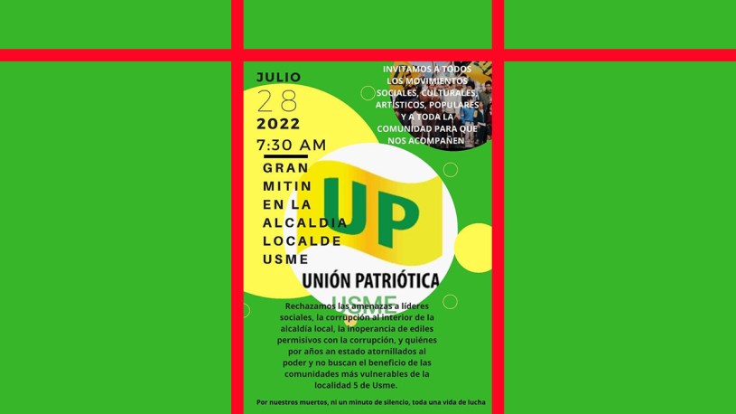 Este jueves 28 de julio a partir de las 7.30 AM. se realizará un mitin frente a la Alcaldía Local de Usme en rechazo a los actos de corrupción, en rechazo a las amenazas a líderes sociales, en rechazo a la inoperancia de ediles acomodados que no garantizan la dignidad del pueblo y quiénes se han quedado callados frente a los presuntos actos de corrupción.
