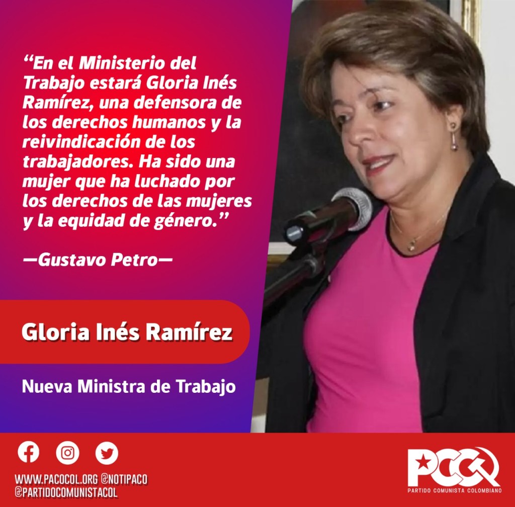 Como un gran acierto y reconocimiento a una mujer luchadora y experimentada han calificado desde distintos sectores la decisión del Presidente de la República, Gustavo Petro, de designar como ministra del trabajo a Gloria Inés Ramírez, dirigente de la Unión Patriótica UP y del Partido Comunista Colombiano PCC. ♦