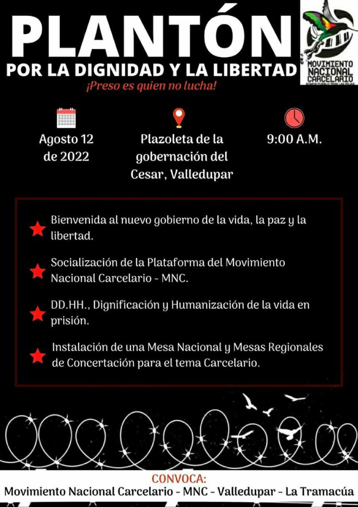 El Movimiento Nacional Carcelario – MNC, que es el Movimiento Social de base de las personas privadas de la libertad, sus familiares organizados en Asociaciones y personas solidarias convocan a jornadas de plantones y otras actividades pacíficas para visibilizar su situación en prisión y pedir la instalación de una Mesa Nacional y Mesas Regionales de diálogo con el nuevo gobierno, las instituciones del sistema penitenciario y carcelario, organismos de control, y organizaciones de DD HH. con la participación activa de sus directos dolientes las y los presos y sus familias.