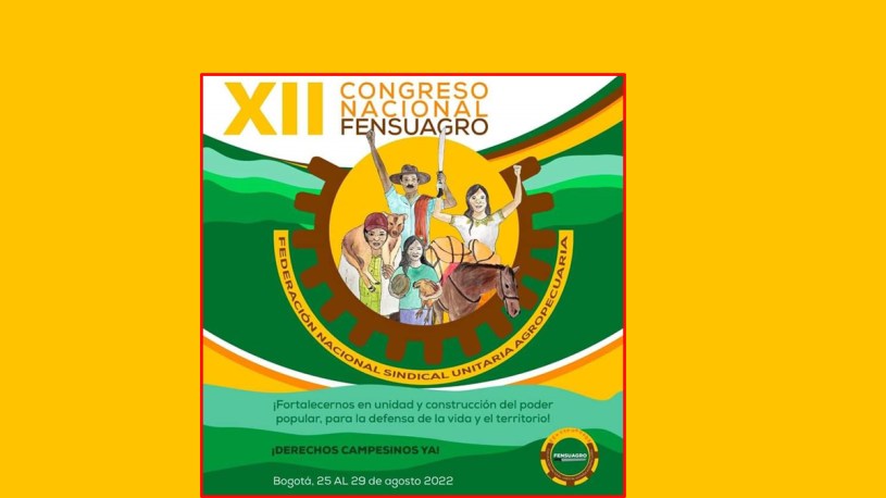 Durante los días 25 al 29 de agosto de 2022 se desarrollará en Bogotá el XII Congreso Nacional de la Federación Sindical Agropecuaria de Colombia Fensuagro-Cut. Según la convocatoria emitida por el comité ejecutivo de esta organización que agrupa hombres y mujeres del campo el evento «será un espacio de construcción política y colectiva, construcción territorial».