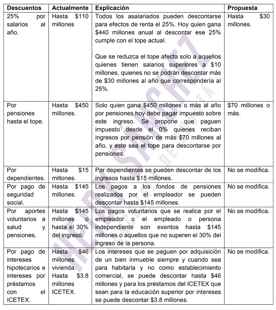 Sumado, hay que señalar que esta propuesta no baja el rango de ingresos para tributación, por el contrario, busca cada vez más la equidad y progresividad en el recaudo, ya que quienes ganan más no van a poder descontar altas sumasgracias a las exenciones que existían y si deberán aportar proporcionalmente a sus ingresos, en impuestos.