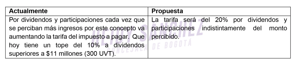 En este ítem la propuesta más destacada es la modificación dirigida a las instituciones financieras, quienes siempre perciben altas tasas de ganancia, las cuales tendrán que pagar 3 puntos adicionales al 35% del impuesto ya establecido para personas jurídicas. Es decir, el 38% de renta, si su renta gravable (utilidad) es igual a superior a $4.560 millones anuales.