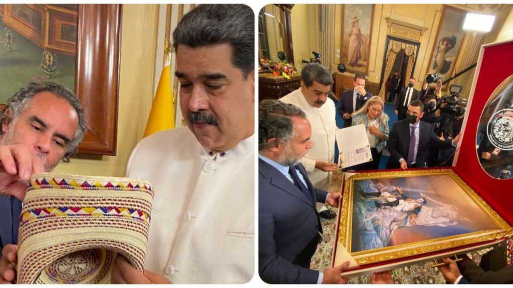 Maduro lució de blanco y un sombrero vueltiao con la bandera de Colombia que le regaló el embajador de Colombia. Por su parte, Benedetti fue más formal, de traje y corbata. El Palacio de Miraflores, sede del encuentro, le permitió al presidente venezolano enseñarle al exsenador su despacho y sus intenciones: restablecer relaciones comerciales con Colombia, un país que llama su hermano. Un cuadro gigante del libertador Simón Bolívar, que obsequió el mandatario bolivariano al diplomático de este país, sirvió de testigo en la reunión.