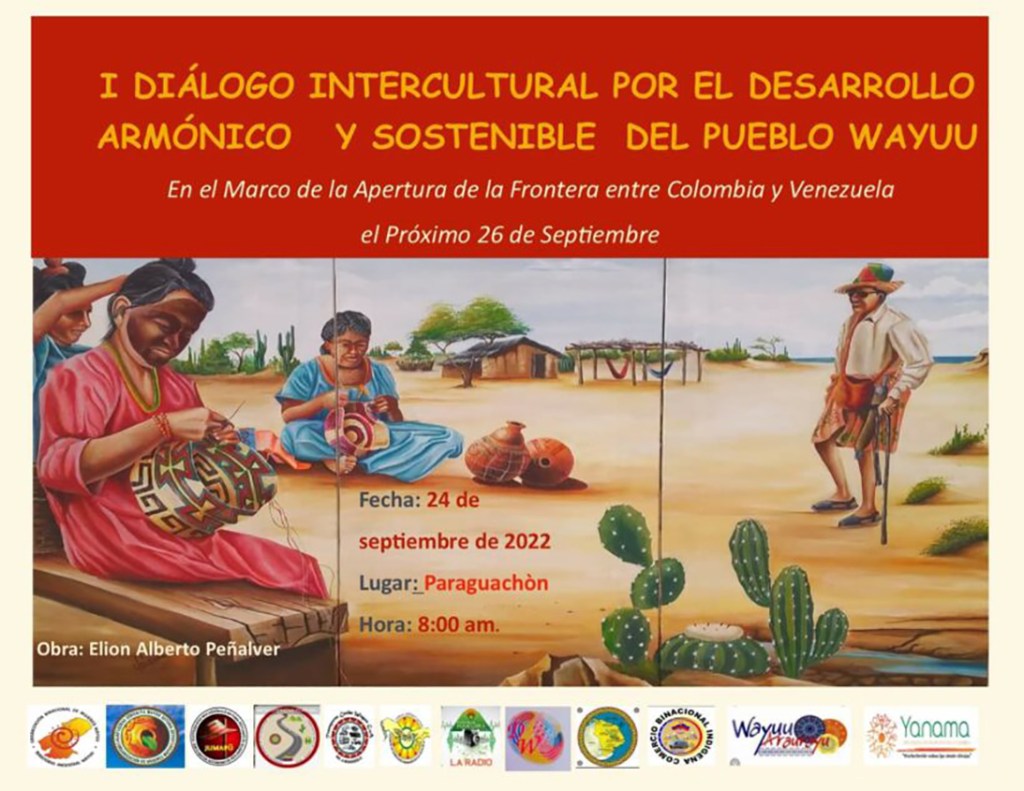 Tomando en cuenta todos los aspectos mencionados, las organizaciones indígenas: Comité de Derechos Humanos de La Guajira, Comercio Binacional Indígena, Organización Binacional de mujeres Wayuu, Organización Yanama, Junta Autónoma de Palabreros, Asociación de Wayuu Araurayuu, Autoridades tradicionales y otras fundaciones indígenas, con base en las reflexiones y conversaciones wayuu, convocan para el próximo 26 de septiembre al “I Diálogo Intercultural por el Desarrollo Armónico y sostenible del pueblo wayuu” en la comunidad indígena de Peluchón zona fronteriza.
