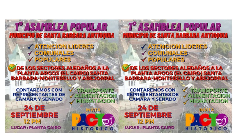 Representantes de organizaciones sociales que hacen parte del Pacto Histórico de los municipios de Santa Bárbara, Montebello y Abejorral invitan a las comunidades que habitan los sectores aledaños a la planta cementera de la compañía Argos (El Cairo) para que participen en la asamblea popular el día sábado 24 de septiembre a la 12 M. El encuentro analizará diversas problemáticas sociales y ambientales y trazará los derroteros organizativos de las comunidades.