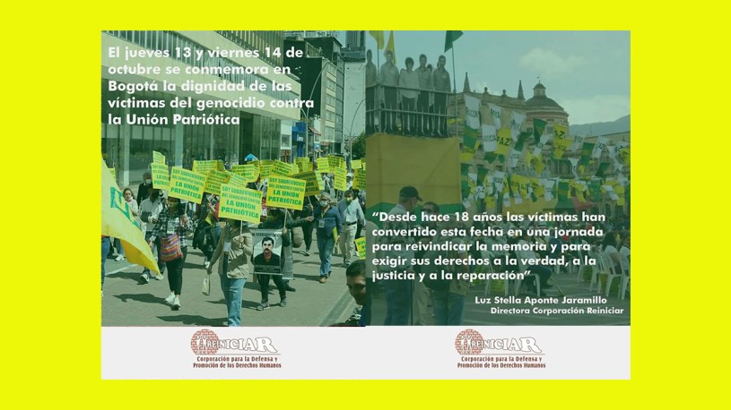 “En esta fecha se conmemora la dignidad de las víctimas del genocidio contra la UP quienes desde hace 18 años la han convertido en una jornada para reivindicar la memoria, la dignidad y para hacer exigibles sus derechos a la verdad, a la justicia y a la reparación. En esta ocasión la coordinación se reúne bajo el lema Es hora ya de justicia para las víctimas del genocidio contra la Unión Patriótica, dándole al país el mensaje de la necesidad de que se haga justicia y se supere la impunidad en el genocidio”