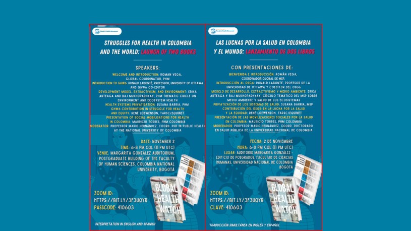 El próximo 2 de noviembre, el auditorio Margarita González del Edificio de posgrados de la facultad de Ciencias Humanas de la Universidad Nacional de Colombia tendrá lugar el lanzamiento para Colombia de la sexta edición del Observatorio de salud global, libro editado por el Movimiento por la Salud de los Pueblos, en el evento bajo el título “Las luchas por la salud en colombia y el mundo” también se lanzará el libro Movilizaciones sociales por la salud en Colombia, una publicación de la Pontificia Universidad Javeriana y la Universidad Nacional de Colombia con la edición de Jairo Ernesto Luna García, Mauricio Torres Tovar del MSP Colombia y Román Vega Romero, Coordinador Global del MSP.