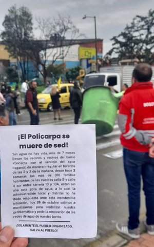 Los habitantes del barrio Policarpa cansados de esperar más de un año una solución decidieron tomarse un carril de la Carrera décima con calle 3, producto de esas manifestaciones se instaló una mesa de trabajo con presencia de funcionarios de la Alcaldia local de Antonio Nariño, la Gerencia del acueducto, Personería y Contraloría Distrital y las organizaciones de oa comunidad, ello permitió que se resolviera la situación con el trabajo de los operarios y así conectar las tuberías a un tubo madre, con el compromiso de cambiar las tuberías de asbesto existentes.