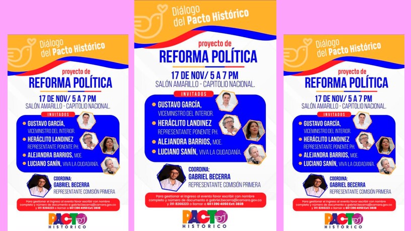 Para el día jueves 17 de noviembre a partir de las 5:00 PM en el Salón Amarillo está prevista la jornada de Diálogo sobre la reforma política, evento organizado por legisladores de la bancada del Pacto Histórico.