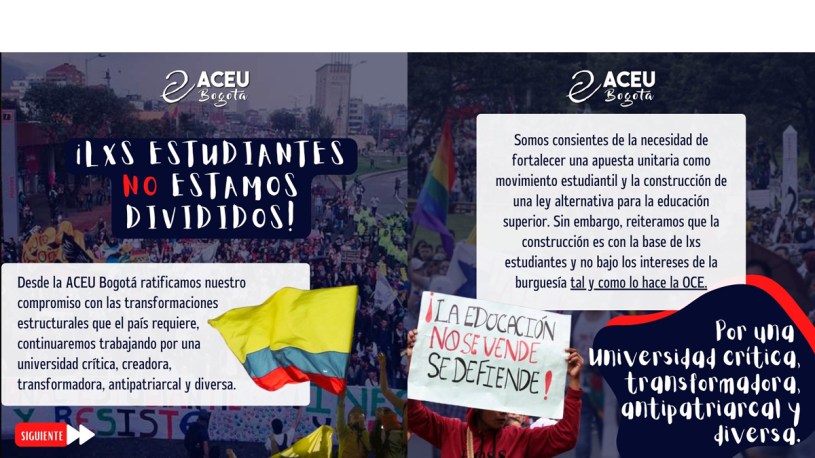 «Somos una organización que lleva más de 24 años luchando por transformar la educación superior en el país, que ha priorizado construir la unidad del movimiento estudiantil, por eso, nuestro proyecto colectivo no nace, ni mucho menos muere, con el petrismo ni la actualidad política de Colombia», indica el pronunciamiento de la ACEU.