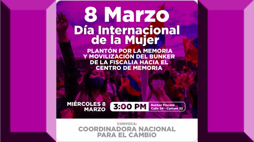 En especial en la concentración el miércoles 8 de marzo a partir de las 3.00 PM frente a las instalaciones del Búnker de la Fiscalía General de la Nación, calle 24 con Carrera 52, Bogotá. Desde ese lugar iniciará el recorrido de la marcha hacia la plaza de Bolívar.