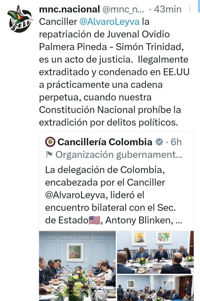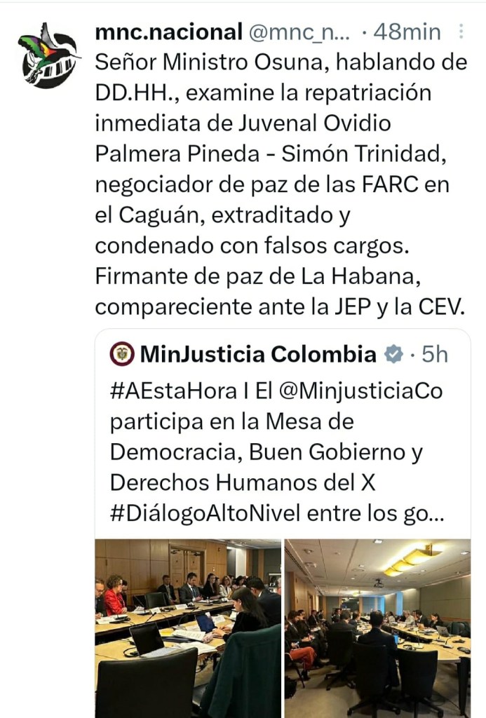 El Movimiento Nacional Carcelario MNC pidió al Gobierno Nacional del Presidente Gustavo Petro Urrego solicitar al Presidente de los Estados Unidos la liberación y repatriación del prisionero político y dirigente de las extintas FARC-EP, Juvenal Ovidio Palmera Pineda – Simón Trinidad, Ilegalmente extraditado y condenado en EE.UU a prácticamente una cadena perpetua.