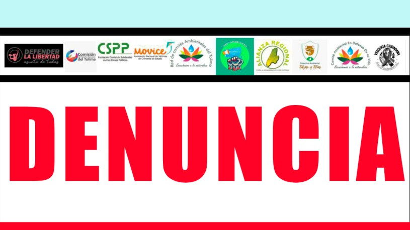 La campaña defender la libertad asunto de todas, la Comisión de Derechos Humanos del Tolima, la Fundación Comité de Solidaridad con los Presos Políticos (FCSPP), el Movimiento Nacional de Victimas de Crímenes de Estado (MOVICE), el Comité Ambiental en Defensa de la Vida (CADV), la Red de Comités Ambientales del Tolima (REDCAT), Voces del Norte del Tolima, Alianza Regional Contra la Megaminería, el Colectivo Ambiental Falan y Frías y la Veeduría Ciudadana Palo ‘Ambiental se permiten denunciar a nivel nacional e intemacional lo siguiente.