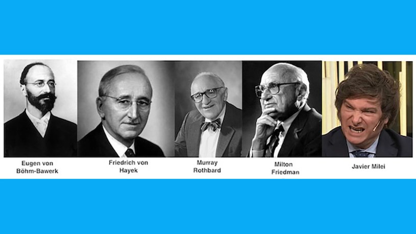 En materia económica, los “libertarios” o “anarco-capitalistas” -como Milei- retornan a las viejas ideas de los manchesterianos ingleses del siglo XIX, pasan por la escuela austríaca (ante todo Friedrich von Hayek y, además, C. Menger y F. Wieser) y llegan a los contemporáneos neoliberales (Milton Friedman). Utilizan a viejos críticos de Marx como Eugen von Böhm-Bawerk (1851-1914); y entre sus padres intelectuales encabeza Murray Rothbard y junto a él Ludwig von Mises y Hans-Hermann Hoppe (además: J. A. Schumpeter, E. Lederer, R. Reisch, W. G. F. Roscher, B. Hildebrand y K. Knies). Una mezcla de profesores destacados, alabadores del capitalismo, enemigos de todo socialismo, radicales antimarxistas y utopistas de una sociedad basada en el mercado libre, la propiedad privada, sin Estado. El eje de sus planteamientos económicos se halla en la teoría subjetiva del valor, a la que consideran que les otorga la “superioridad moral” frente a la teoría objetiva del valor de Marx. Pero ese debate ya viene desde el siglo XIX y si alguien quiere seguirlo puede acudir a una “vieja” edición de los reconocidos Cuadernos de Pasado y Presente de 1974, en la que se confronta a Böhm-Bawerk y Hilferding (https://shorturl.at/jOQR8).