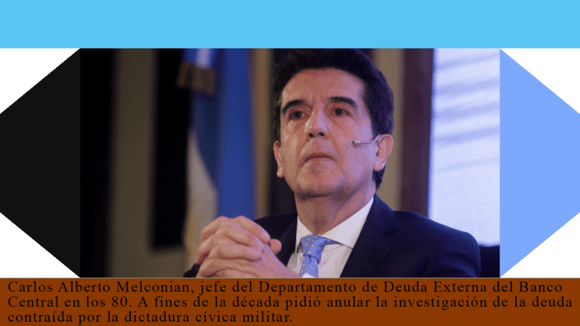 Uno de los mentores de ese remplazo de títulos firmados en el final de la dictadura por Domingo Cavallo y Dagnino Pastore, y por Julio González del Solar y Jorge Wehbe, y obviamente asesorado por los abogados y contadores de las grandes empresas beneficiadas, fue el (en esa época) jefe del Departamento de Deuda Externa del Banco Central de la República Argentina, Carlos Alberto Melconian.