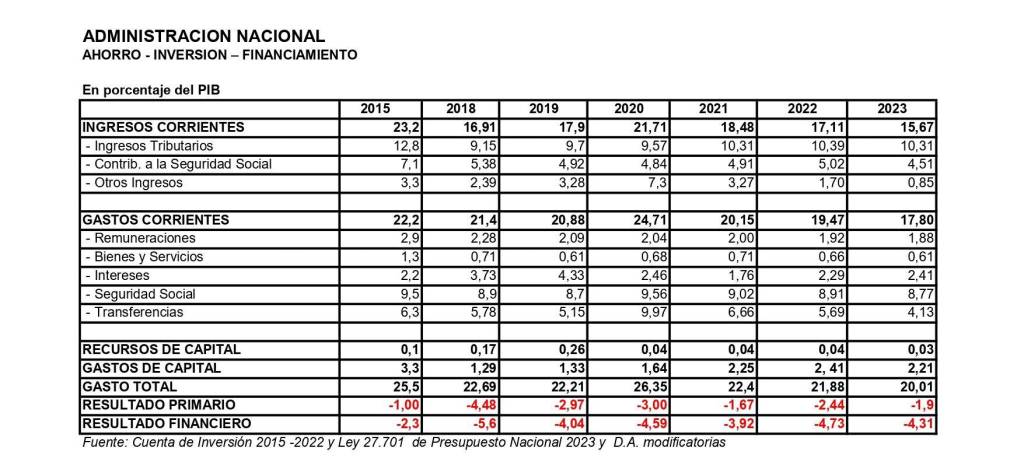 Plantean reducir el gasto público para reducir los impuestos, cuando el total de los ingresos tributarios en el año 2022 fue de solo el 10,39 % del PIB y este año se calcula que va a ser del 10,31 % del PIB, obligando al Estado a colocar títulos de deuda en el mercado interno que al 31 de agosto 2023 ascienden a 3,8 billones de pesos (equivalentes a unos 10.500 millones de dólares) en títulos ajustables por inflación o por dólar linked (oficial), para financiar el gasto público.