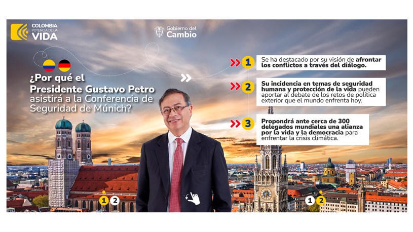En una publicación en las redes de la Presidencia se afirma que las razones por las que el jefe de Estado asistirá a la mencionada conferencia es por su capacidad de «afrontar los conflictos a través del diálogo». En este punto, se destaca su política de ‘paz total‘, que ha fomentado las conversaciones y el cese al fuego temporal con grupos armados como el Ejército de Liberación Nacional (ELN) y el Estado Mayor Central (EMC) de las Fuerzas Armadas Revolucionarias de Colombia (FARC), entre otras organizaciones.