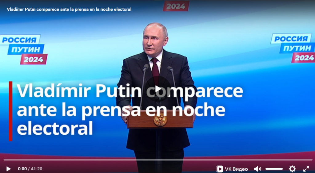 El presidente de Rusia, Vladímir Putin, se dirige a la población del país luego de que se divulgaran los primeros resultados del conteo de los votos emitidos en las elecciones presidenciales. Con el 77,65 % del recuento completado, Putin obtiene el 87,14 % de los votos, seguido de Nikolái Jaritónov del Partido Comunista de la Federación de Rusia (4,22 %); Vladislav Davankov del partido Gente Nueva (4,07 %) y Leonid Slutski del Partido Liberal-Demócrata de Rusia (3,16 %).