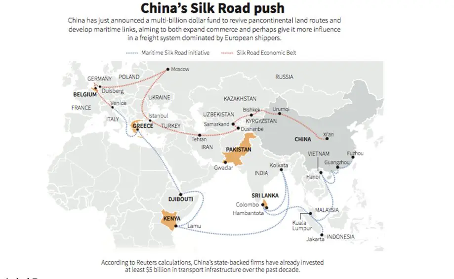 China en su proceso de desarrollo, propuso y desarrolla desde 2016 su famoso proyecto estratégico de la Ruta de la Seda. Un multi-billonario proyecto terrestre y marítimo para desarrollar rutas comerciales terrestres y marítimas entre China, Europa y África. El siguiente gráfico ilustra dicho proyecto.