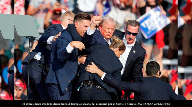El expresidente de Estados Unidos Donald Trump sufrió un atentado este sábado cuando daba un mitin en Butler (Pensilvania). Llevaba unos minutos hablando cuando se oyeron unos disparos. Se llevó la mano derecha a la cara, como si hubiera recibido un impacto, se vino al suelo y fue cubierto por agentes del servicio secreto. Resultó herido leve por una bala que le alcanzó la oreja. Se retiró del escenario con un reguero de sangre en la cara y con el puño en alto entre los vítores de sus seguidores. El tirador, del que se desconoce su identidad y motivaciones, fue abatido por los servicios de seguridad. También murió un asistente al mitin y otro resultó herido grave. El ataque está siendo investigado como un intento de asesinato.