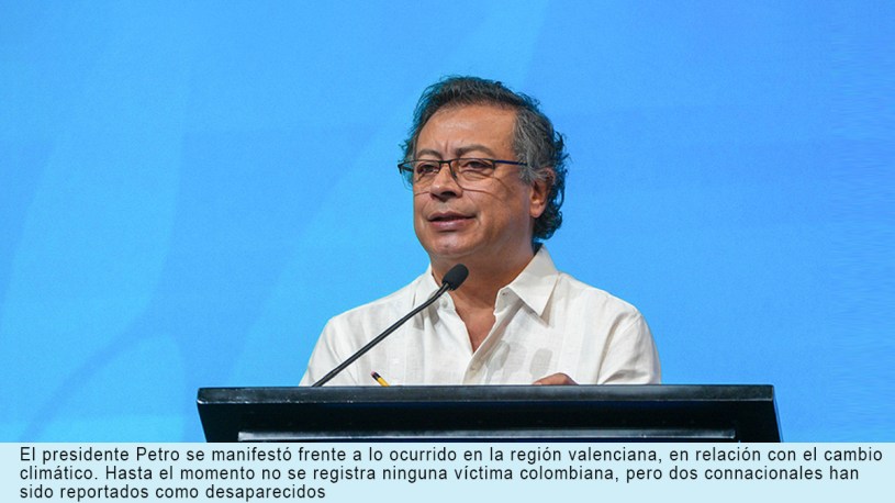 Sobre lo ocurrido en la región ibérica, el presidente Gustavo Petro se manifestó en su cuenta de X, en un momento en que Colombia lidera la cumbre que busca encontrar medidas para frenar el deterioro de la biodiversidad del planeta en el marco de la COP 16, en Cali: “El colapso climático en España es un resultado de no detener la economía fósil. Sabemos que el consumo de petróleo, carbón y gas puede exterminar la vida en el corto plazo, pero no les importa a los poderes del mundo, hasta que la humanidad reaccione”.