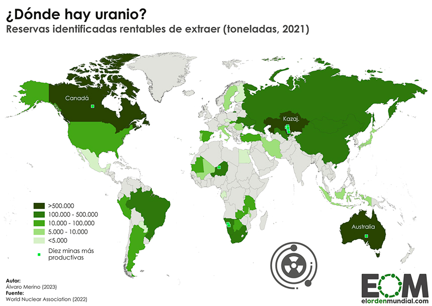 No obstante, el uranio no está distribuido uniformemente alrededor del mundo. Sino que, los países que cuentan con la mayor producción son: