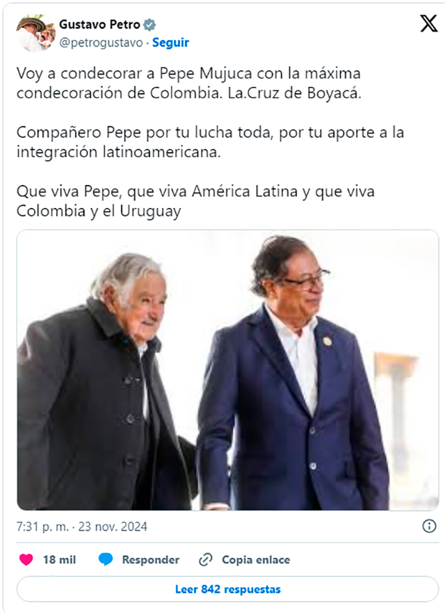 El mandatario aseguró que el reconocimiento a Mujica se debe a su «lucha» y «aportes» a la integración de Latinoamérica. «Que viva Pepe, que viva América Latina y que viva Colombia y el Uruguay», se lee en el mensaje de Petro, acompañado de una foto con el exmandatario uruguayo.