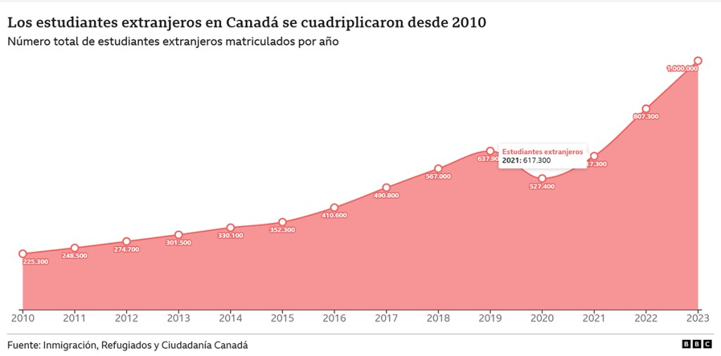 Más de 800.000 estudiantes extranjeros vivían en Canadá en 2022, frente a 214.000 una década antes.