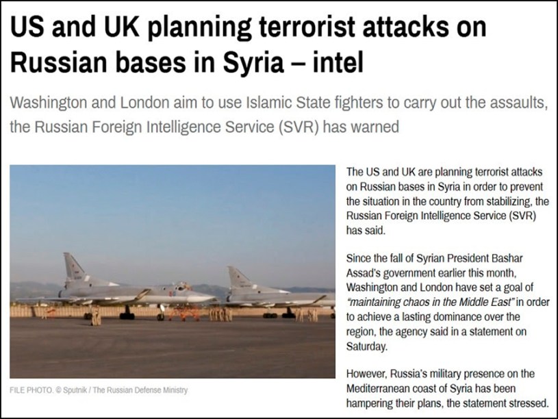 El Servicio de Inteligencia Exterior de Rusia (SVR, por sus siglas en inglés) acaba de advertir que las bases sirias de su país pronto podrían ser objeto de ataques con vehículos aéreos no tripulados por parte de terroristas de ISIS respaldados por angloestadounidenses. Al parecer, esta provocación está siendo tramada como parte de su política para convertir el caos regional en un arma, provocar problemas entre Rusia y las nuevas autoridades sirias, y luego conducir a una victoria de las relaciones públicas occidentales al provocar la retirada de las fuerzas rusas. Rusia se vería en un dilema, ya que no podría saber con certeza si las nuevas autoridades no están involucradas.