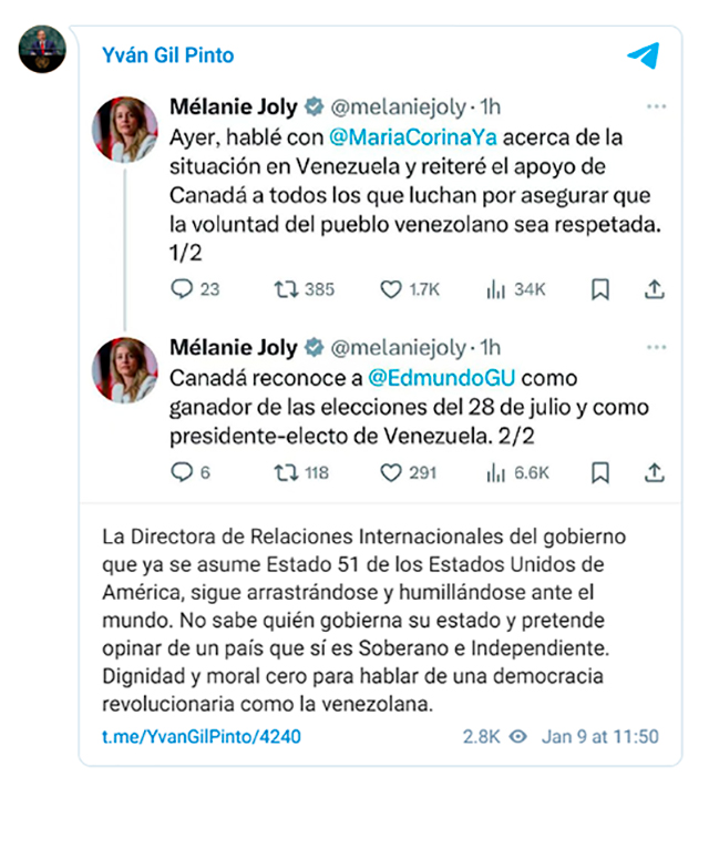 En una publicación en su canal oficial de Telegram, Gil destacó que este personaje «que ya se asume Estado 51 de los Estados Unidos de América, sigue arrastrándose y humillándose ante el mundo» al declarar que Canadá reconoce a González Urrutía como ganador de las elecciones del 28 de julio y como presidente electo de Venezuela.