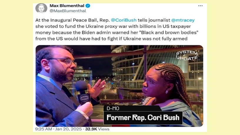 La exrepresentante demócrata Cori Bush dijo al periodista Michael Tracey que ella y otros demócratas votaron a favor de una mayor ayuda armada a Ucrania porque la administración Biden lo presentó como una forma de evitar que los soldados estadounidenses fueran desplegados para luchar contra Rusia si Ucrania era derrotada. Luego agregó que los miembros del servicio militar de su distrito son “en su mayoría personas negras, morenas y marginadas”, por lo que consideró que esto era un medio para evitar que “cuerpos negros y morenos” fueran asesinados.