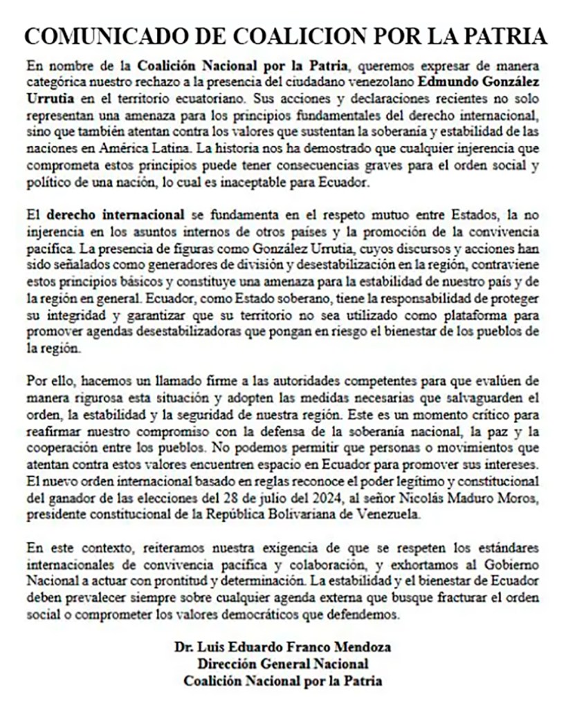 La Coalición Nacional por la Patria de Ecuador rechazó en un comunicado la presencia en Ecuador del ciudadano venezolano Edmundo González Urrutia, excandidato de la extrema derecha a las elecciones del pasado 28 de julio en Venezuela.